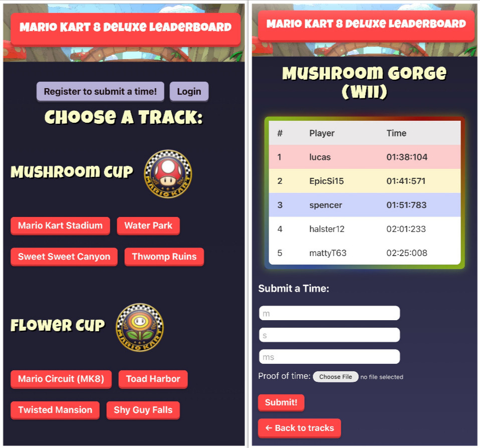 Developed a Flask-based leaderboard web app where players can upload and compare time trial records for Mario Kart 8 Deluxe, with backend data stored in PostgreSQL.